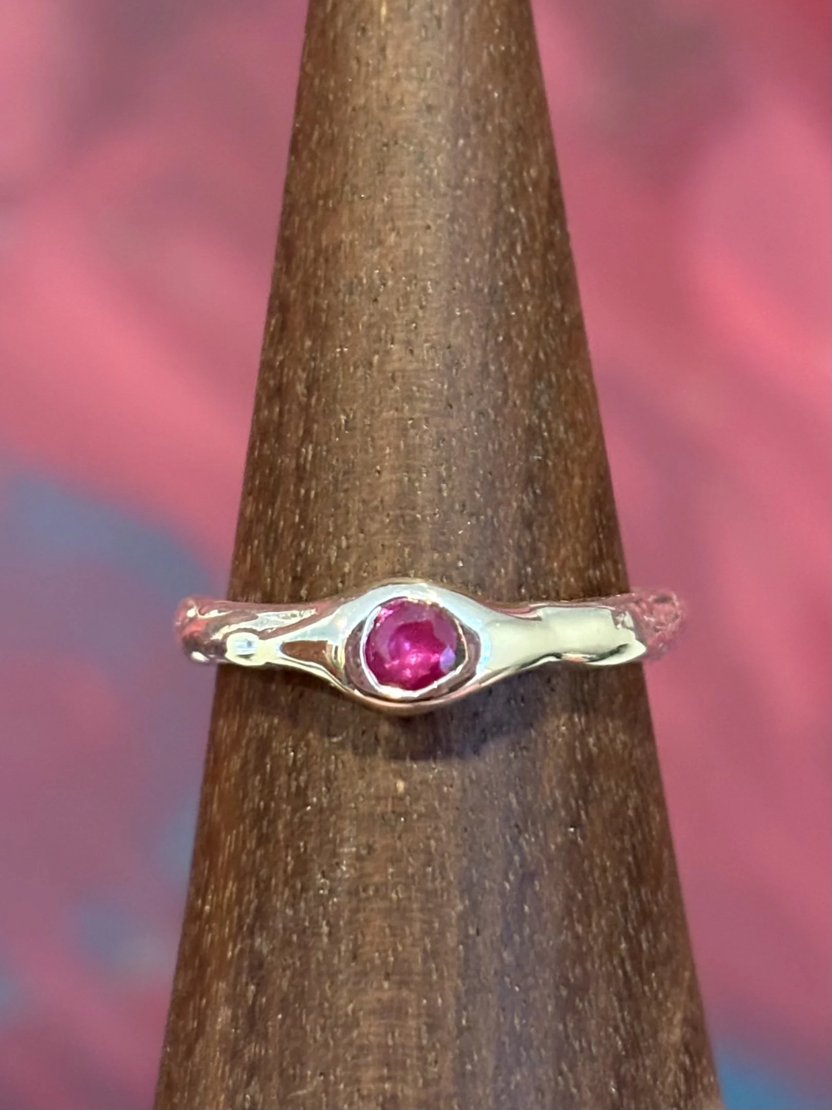 Image 1 of 2 Image 2 of 2 Ember Ring $180.00 4mm dazzling gemstone set in a drippy, molten textured sterling silver band Sterling Silver: Pink Tourmaline - Size 7.25 Green Tourmaline - Size 7 Add To Cart Added! 4mm dazzling gemstone set in a drippy, molten textured sterling silver band